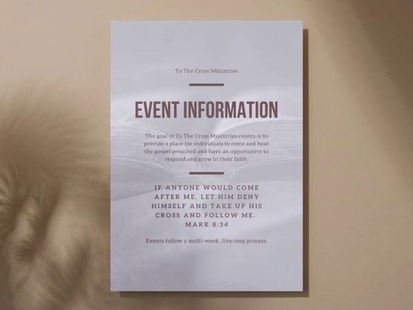 The goal of To The Cross Ministries Events is to provide a place for individuals to come and hear the gospel preached and have an opportunity to respond and grow in their faith. These events will be hosted at a church or similar facility where individuals will be invited to come and listen. Events follow a multi-week, five-step process. More information on our events can be found in the document below. Or feel free to email matt@tothecrossministries.com with any questions.